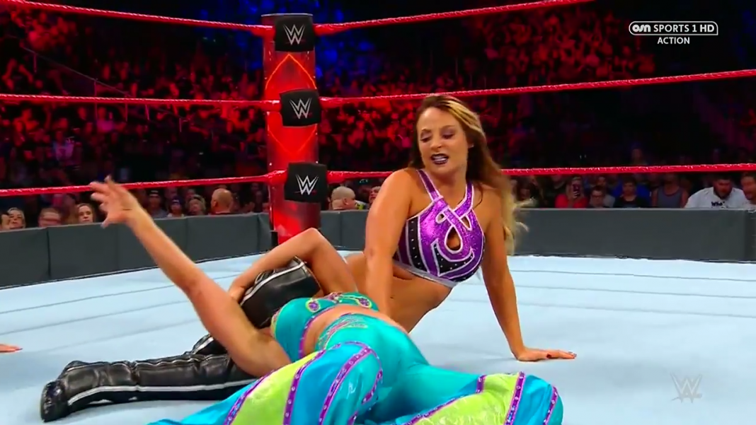 When we return, Mickie is in full control of the match, taking Emma down with various kicks. She sets Emma up for the Mickie-D-T but Emma is able to escape with an elbow shot to the head. Emma runs the ropes but Mickie hits a flapjack upon arrival, taking Emma down. With Emma on the mat, Mickie goes to the top rope of a turnbuckle and lands her favorite seated senton!