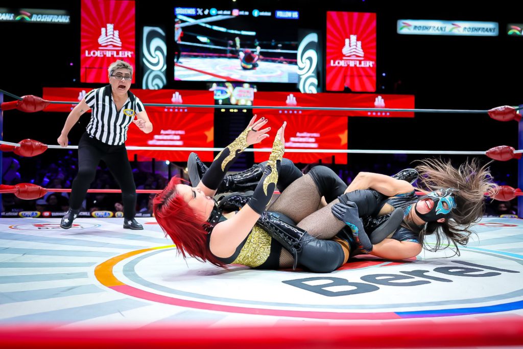After scoring the first fall via submission, Sanely was in the receiving end of most of their offenses when the team led by Dark Silueta performed various tag team moves on her.