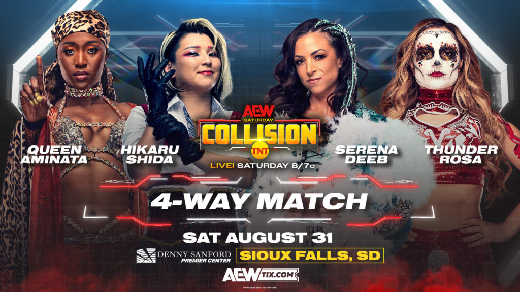 A four way women’s match has been added for the Aug. 31 episode of AEW Collision. The participants are Hikaru Shida vs. Queen Aminata vs. Serena Deeb vs. Thunder Rosa.