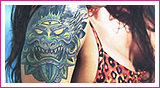 • an illustration of a dragon wrapped around the lettering on the left side of her torso.