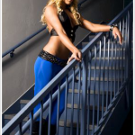 Michelle McCool‘s well known for her spiritual outlook – hence the “Stairway to Heaven” photoshoot title/play on words. But does she look heavenly as they say? It’s kind of a unique look, what with the bright, cobalt blue pants and vest combo. I’m digging it, though. The blue of the stairwell compliments the pants, and the fact that everything else is black keeps the look from going overboard. Overall, Michelle looks great – she’s got everything working well as far as I’m concerned. But, to reference Led Zeppelin for a moment, what with the Supplemental draft starting in a few moments as of this writing, does she have “all the glitters” (as in gold) in her future? Is RAW her destination, or is she destined to be SmackDown’s Diva Champion? Maybe none of the above? I know thoughts on her are mixed around here, but personally, I feel she has nowhere to go but up. Okay, enough with the stair metaphors..