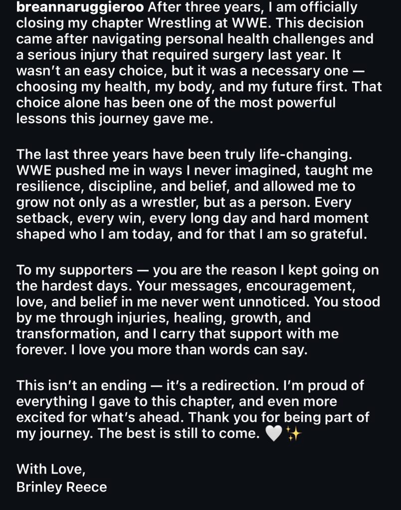 NXT’s Brinley Reece has confirmed her departure from WWE. Reece, real name Breanna Ruggiero, worked for the promotion for three years and has recently been out of action due to an injury/health concerns.