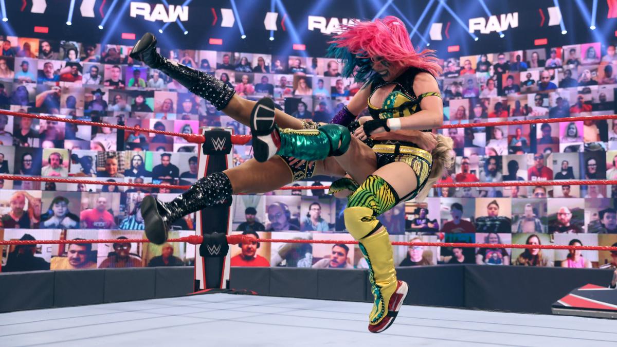 After she sidesteps Asuka who goes after her in the corner Bliss ends up on the other side of the ring and then turns into her “pain” character after the lights went out. Asuka tries to go after her immediately. All the hits and kicks Asuka delivers keep getting swatted away by Bliss until a knee catches her. Asuka then tries to lock in the Asuka Lock but Bliss overpowers her. Bliss then gets the mandible claw in on the champion and was perhaps mere moments away from becoming the new RAW Women’s Champion.