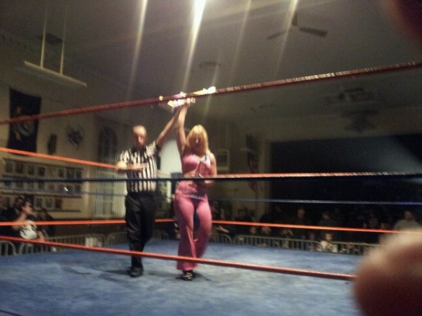 Rachel Summerlyn beat Portia Perez via Texas Cloverleaf in a crazy, wild brawl. It wasn’t announced as no DQ, but the match happened more out of the ring then inside it. The highlight was Rachel decking Portia with a prosthetic leg all while the crowd chanted “USE THE LEG!” Rachel was crazy over with the fans. I can’t tell you how wild the crowd was for this match. Match of the Night IMO.