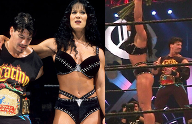 It was made of some sort of velvet material, adorned with jewels, and really made Chyna look like a Queen. Chyna wore this when she accompanied Eddie Guerrero to the ring for his match against Val Venis.