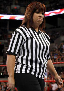 We’ve seen plenty of guest referees in the past…not exactly everyone we’d want to see in that position but we’ve seen lots of them. The Divas have often been placed into this unfortunate and random position plenty of times. Not only do they have to blindly walk around throughout the match not really knowing what to do…but they have to wear those HIDEOUS vertical stripes. Ladies, I feel your pain.