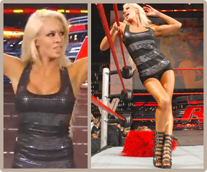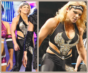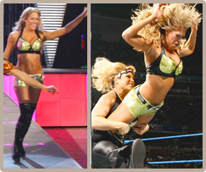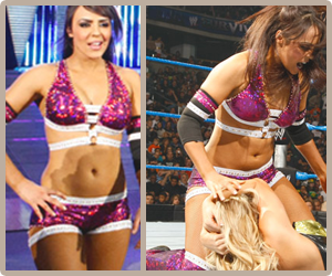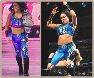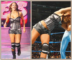 Erin: Jillian’s ring gear is usually the most boring of all the Divas’ looks, but this color is definitely unique. I like that shade of powder blue, but it’s a bit overwhelming without another color to break it up a bit. 6/10