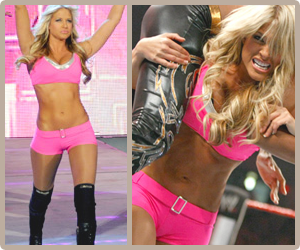 Erin: What a surprise, hot pink! As I mentioned on the Post-Raw Roundtable, the hot pink kinda counteracted with her dark tan and bright blonde hair and kind of blinded me with its harshness. It’s nothing special, really — it’s just the outfit that comes packaged with every “Wrestling Champion” Barbie (at a Toys-R-Us near you!!). 4/10