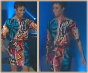 Erin: Mickie kind of looks like a sassy school teacher here–the blouse and earrings give me that vibe. The print top, along with the big earrings, hair acessory, and wild hairstyle make the whole upper half wayyy too busy. Maybe if she lost the crazy earrings it’d tone it down a bit. 6/10