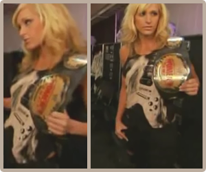 Erin: She kind of looks like she’s wearing a bunch of those reflective safety stickers. I like that she’s going for a unique type of ring gear with the non-matching top and shorts, but it just doesn’t fit together well and makes the outfit look kinda slapdash. I like the purple, though, if that’s worth anything. 6/10