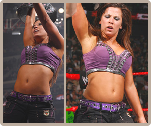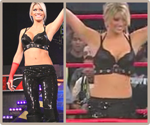 Melanie: I like it, but I’m not loving it. I felt she could’ve gone for more of a black sequined look like Michelle wore on SmackDown or Torrie used to wear, that would’ve looked better. As is, I think it looks a little garish. 5/10
