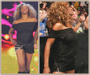 Tiffany: Rosa Mendes’ Raw outfit gave me some serious Ashley Massaro whiplash. Ashley could barely pass for wearing mesh, and Rosa doesn’t even come close. The cheap rose design reminds me of Chinese slippers. Sorry ladies, but Lita did it best. 4/10