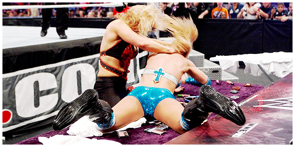 Michelle rolls to the outside and picks up a red mop bucket. Whatever’s inside she tosses on Matt Striker in frustration (perhaps she was listening to the commentary?) and she reaches for what seems to be the supporting guest star in this match: the ironing board. As she goes to crawl back into the ring with it, Beth drop kicks her, and Michelle flies back into the make-up table, bouncing her head off it in the process. The crowd is shocked at the sheer brutality of the spot and Beth goes to capitalize. She’s greeted by Layla and Vickie who double team her long enough for Michelle to stand up in a dazed state and grab another can of hair spray. Beth wiggles away from Layla and Vickie just in time for Michelle to spray her BFF in the face. Layla starts screaming that she’s blind and Michelle slams the Aqua Net to the ground in disbelief that Layla just got sprayed instead of Beth. Beth grabs Michelle by the hair and throws her right across the make-up table giving all of us reason to think something awful is about to happen to McCool. Beth keeps her grip on Michelle’s hair and slams the other woman’s face into the wood a couple of times before just pushing the table over and sending Michelle sprawling onto the mat.