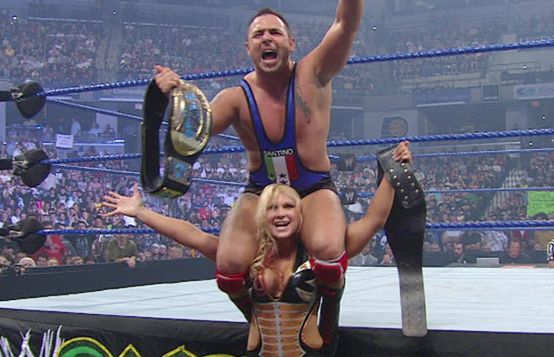 Another SummerSlam, another Mixed Tag Team match with the Intercontinental Title on the line. This time, though, the Women’s Title was up for grabs too. Champs Mickie James and Kofi Kingston took on Beth Phoenix and Santino. Beth would pin Mickie to bring the belts home to Glamarella. Santino looked especially regal during their celebration, sitting on Beth’s shoulders with both titles in hand.