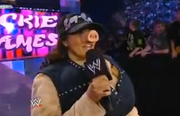 The “Piggie James” storyline is a sore spot for some Diva fans. They feel that the storyline–which centered on Layla and Michelle McCool mocking Mickie James for her weight–was too absurd. Perhaps its most absurd moment came when Layla (dressed in a fat suit as “Piggie James”) wrestled Michelle McCool. Layla obviously lost the match, but the stunt probably humiliated those two more than it did Mickie.