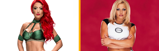 Slowly but surely, Eva Marie is evolving into a well-rounded in-ring performer. While she hasn’t silenced her critics just yet, she would do well to draw inspiration from the ultimate model-turned-wrestler: Trish Stratus. To remind her critics of how hard work can transform a wrestler, Eva could don the look Trish sported when she was just finding her groove in the ring: blonde hair, “100% Stratusfaction Guaranteed” baby tee, flared pants and all.