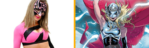 While her identity has already been revealed (no spoilers here!), the mysterious new female Thor confounding readers and gods alike for months, taking the mantle and running with it, wielding Mjolnir and thwarting villains as only a Thor can. Sexy Star’s identity is not in question, but her ever-present mask adds an air of mystery to her fast-paced, high flying brand of wrestling. To maintain her masked persona, Sexy Star could dress as the mysterious female Thor, helmet, armor, cape, hammer and all. She’s more than proven herself worthy, right?