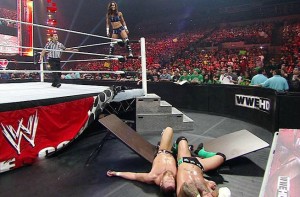 For those who missed it (and you must’ve been living under a rock), AJ closed the show on Monday by pushing CM Punk and Daniel Bryan through a table.
