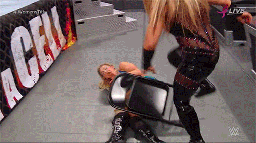 Just as Charlotte is taking control of the match, Natalya gets to her feet. And instead of continuing the match inside the ring, Neidhart gets ahold of a steel chair and hits it across the body of Flair. Ring the bell!