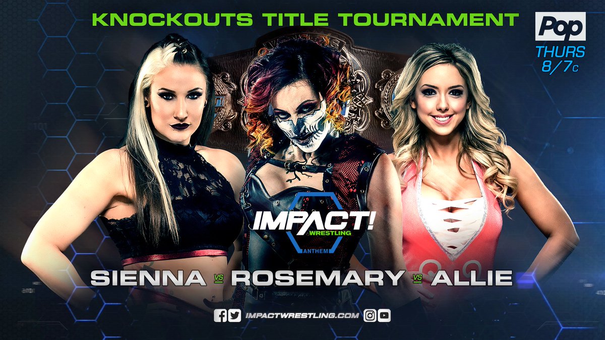 Tonight on Impact Wrestling, the tournament to crown a new Knockouts Champion continues as Allie, Rosemary and Sienna compete in a Triple Threat match.