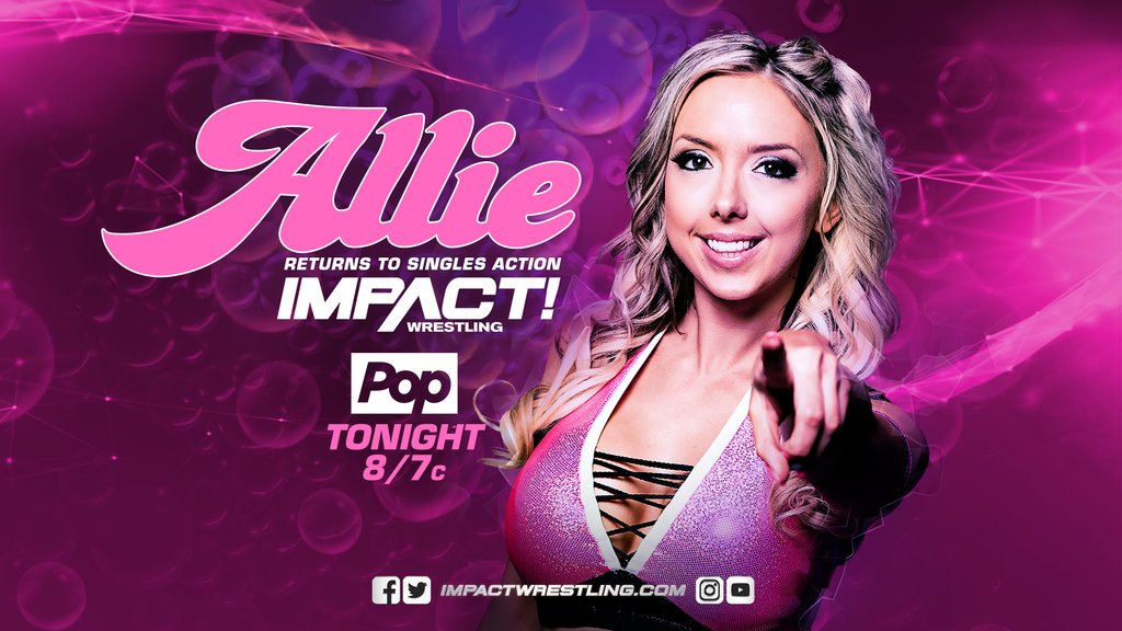 Tonight on Impact Wrestling, Allie makes her return in singles action. As seen on last week’s Impact, Allie picked up a win when she teamed up Madison Rayne to take on the team of Su Yung and one of Undead Bridesmaid.