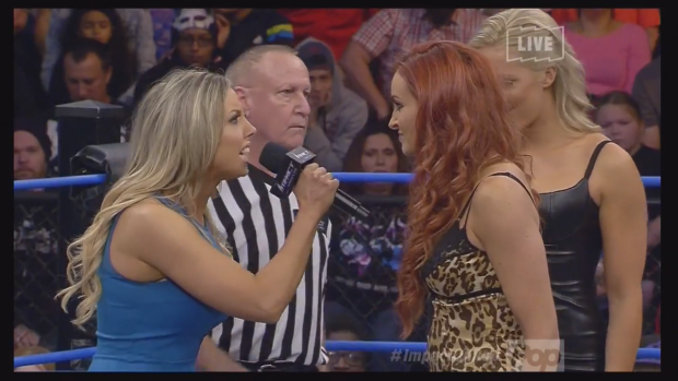 Once we return from a quick break, we find the Lady Squad front and center of the six sided ring. Maria name drops her husband Mike Bennett, noting that it is their one year anniversary since debuting to TNA. With 2016 behind them, Maria is looking forward to what this new year will bring but before she can look ahead, a “little-bitty-teensy-tiny-squeaky” problem needs to be addressed.