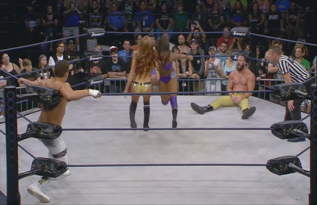 Brandi and Maria scuffle and eventually make their way to the outside of the ring, bumping to a ring post in the process. A chase around the ring leads to all four parties to meet back in the middle, with Brandi laying in her offense to Maria. The match comes to an end when the Bennetts find themselves each in a submission hold and forced to tap out.
