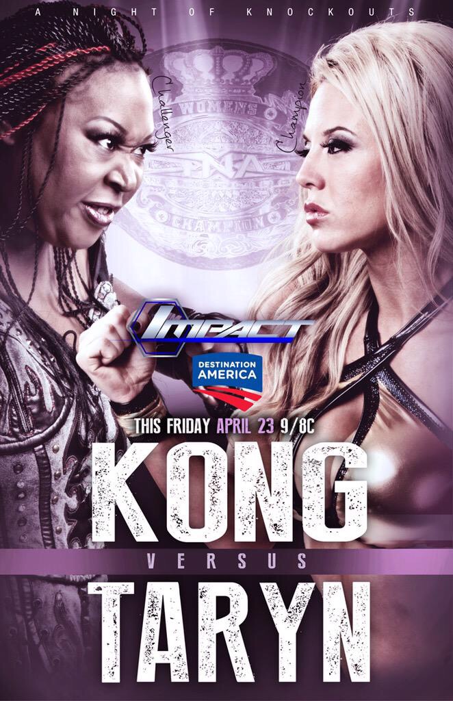She begins by telling everyone that every week she is constantly putting her body on the line and has already proven why she has a place in TNA. Taryn has faced Awesome Kong before and knows how tough she is but Taryn’s fighting spirit is kept alive through her passion for wrestling and her passion for the Knockouts division! Next week, Taryn gives her word that she will prove why she deserves to remain Knockouts champion by defeating Awesome Kong at long last. Having heard enough backstage, the challenger’s music hits and out appears Awesome Kong, who slowly marches towards the ring but is attacked by Taryn as soon as she steps inside!