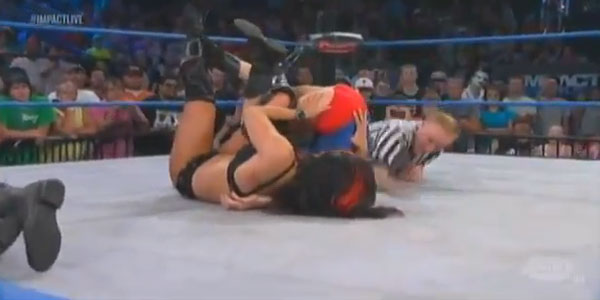 Back inside the ring, Tara drops Madison with the sidewalk slam, but Gail breaks it up. The BFFs continue working Tara over with submissions, before sending her into the nearby corner. Madison gets thrown into the vet, but as Gail flies forward to attempt her elastic type move, Tara moves out of the way and Kim goes flying! Madison with a running facebuster, but Mickie breaks it up before a pin can occur. James and Rayne not go at it against one another, with Hardcore Country dropping her with a neckbreaker. She goes for a pin, but Gail breaks it up. Tara snaps Gail off the ropes and hits a nice flip legdrop for a two count as Kim kicks out to the dismay of the crowd.