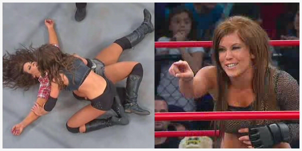 Our first, earth shattering glimpse of TNA beauty comes in the form of Cookie this week. She escorts her slick haired guido, Robbie E. to the ring in an X-Division Title rematch against Jay Lethal. I am still not sure about these two. I have never been a fan of the Jersey Shore and everytime I see them, I feel like I am being forced to watch bad MTV reruns. Nonetheless, Cookie is sporting all black with the purple streaks. Love a curvy woman being on the roster but that outfit was not flattering, Cooks.