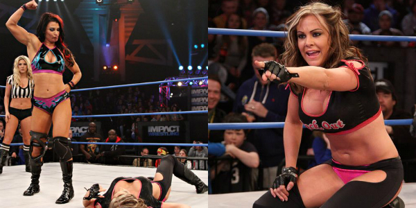 Jesse downplays the weirdness idea (for the moment), by stating this is simply to motivate our champ. He attempts to hype Tara up by calling her a Knockout Superstar, hot and a winner while referring to Velvet’s action figure as small, tiny, plastic, and infatuated with “dead pigeons or something.” (…I laughed) In between this, he also compliments himself a little, before turning it into praise for the both of them as Impact’s dominant power couple, which I think is more of a default accusation as their only competition is a ODB and Eric Young who have only been seen together about once in the past billion months. Jesse’s words of encouragement have worked! Tara is now ready to take the bodysuit clad Velvet Sky down to Chinatown (I’ll never say that again) as their match is next!