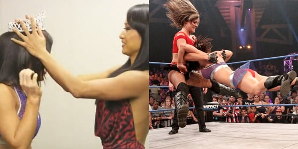 First we had backstage where a very generous Gail Kim has a gift for the woman who tried to take her Knockouts Title from her at Victory Road earlier this month. A peace offering perhaps? Gail gifts Madison a new tiara (her last one was given to then-Knockouts VP, Karen Jarrett) and the Killer Queen is back, y’all! As the pair kiss and make up, Gail tells Madison to take care of Velvet Sky in their match tonight and coincidentally, that match is just around the corner!
