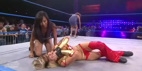 She and Madison execute some nice double team maneuvers in the corner. Gail poses to the booing crowd, as Velvet screams at her from the apron. Sick clothesline by Gail to Mickie, as she clings for a tag to the Knockouts Champion. Gail takes control with a headlock, making sure to keep Hardcore Country away from her partner. Kim tells Velvet to watch and learn, but Mickie manages to counter Gail’s attempt into a “woman’s style neckbreaker” as Mike Tenay claims. Mickie crawls…and crawls…and crawls…and TAGS IN VELVET!