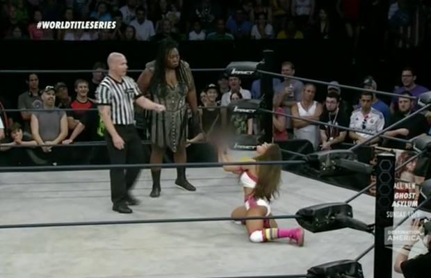 When the submission hold is broken, Brooke immediately hits Kong with a face crusher and goes for the pin, only to earn a two count. The Impact Zone begins to rally behind Brooke, as she climbs ropes of a turnbuckle. However, before Brooke can even make it to the top tope, Kong gets up and strikes Brooke in the head. She mounts Brooke over her shoulders for a sideways slam.