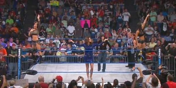 Tara steps in right where Brooke left off, until Madison reverses the wrist lock into one of her own. Tara flips over with a one armed cartwheel, before tagging back out to Brooke, who takes Madison down with a few nice armdrags into an arm lock. Tara with the quick tag back in, as the two drop Madison with a double team front suplex. Tara removes her top, as Gail steps in and gets all up in Tara’s face. Kick to the stomach by Kim, as she sends Tara off the ropes. Tara with a kick to the shoulder, following it up with a set of clotheslines, as Gail begs for her newfound speaking life!