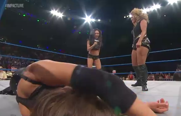 Just as Velvet turns the tables an is about to hit Brooke with a finisher, Gail enters the ring and hits her from behind, bringing the match to an end. She hits Velvet with the Eat Defeat, then orders Tapa to take out the rest. Tapa hits Brooke with the TKO as ODB pops up out of nowhere to toss Gail out of the ring.