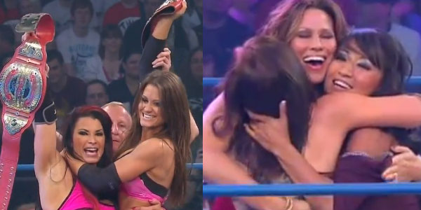 I could start this TNA Recap in many ways. Possibly banter on about it being Friday like I was Rebecca Black? Or perhaps run to check and see if Miss Karen‘s eyes are healed from her vicious assault at Bound for Glory, or I could just get to the actual recap of this article. I’m sure nobody would like that first option, and while I would forever defend Miss Karen, I can not make it past TNA security…so let’s just go with option three. This week was Knockouts galore, as Tara and Brooke Tessmacher, collectively known as TNT, defend their Tag Team Titles against Winter and Angelina Love…AND Velvet Sky celebrated her first iMPACT Wrestling episode as Knockouts Champion, albeit a few surprising visitors interrupting.