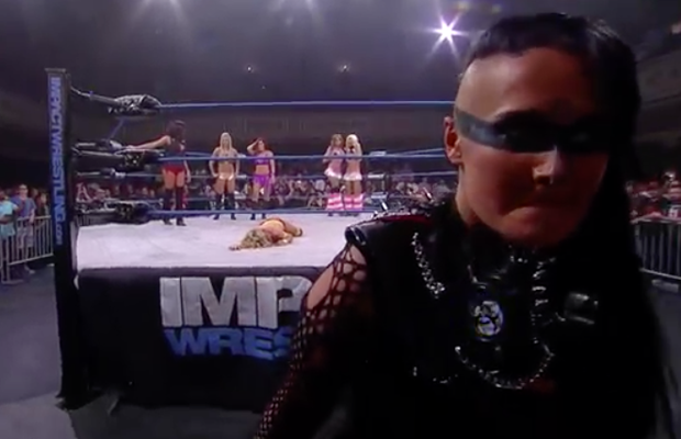 Angelina does not look happy, but Velvet is jumping for joy as she hugs her BFF in celebration. Before any real shenanigans can occur though, someone’s come to crash the party. Havok‘s music hits, and she heads to the ring. But reigning Knockout’s Champ Gail Kim has other ideas, and rushes Havok on the ramp. The two trade blows but Havok overpowers Gail and sends her flying into the steel barricade. Brittany finds herself playing sacrificial lamb as TBP throw her to the wolves in an effort to save themselves. The other ladies in the ring do nothing to stop it either!