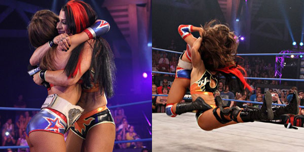 Tara then takes the belt from Brooke and proceeds to strap it around her waist. She announces her best friend, Miss Tessmacher as the official Knockouts Champion! From there, Brooke takes some time to pose on the ring apron as Tara applauds from ringside and Brooke’s music joins her posing. Brooke then decides to step over towards the farthest turnbuckle, and as she turns around… BAM! Tara nails her with a huge clothesline! She then kicks her square in the jaw and proceeds to set up for the Widow’s Peak! She hoists Brooke in the air and drills her right to the canvas, complete with the title around her abdomen. This new mean spirited version of Tara then pats the title and kicks the dust from her boots onto her (former) BFF!