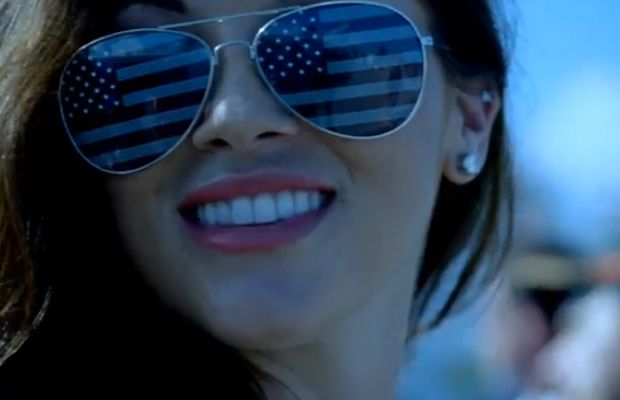 Devin Taylor – real name Brittany Fetkin – can be seen in the last few seconds of the commercial, sporting American flag sunglasses at a Nascar race.