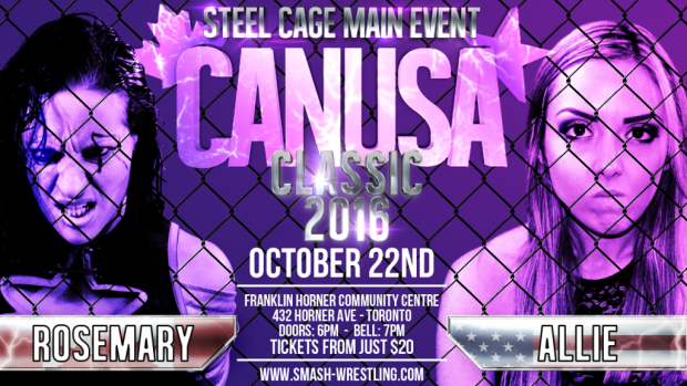 - On October 22nd, SMASH Wrestling will roll out another installment of the Courtney Rush/Cherry Bomb rivalry by making them fight inside a steel cage at this year’s CANUSA Classic. The only announcements that they’ve made is that Cherry Bomb (AKA Allie in TNA) will captain Team USA and Courtney Rush (AKA Rosemary in TNA) will captain Team Canada in a steel cage match as their main event. Cherry recently picked her first team member for Team USA and that is none other than Veda Scott, one of the brightest stars in ROH and women’s wrestling in general. Other members of their respective teams will be announced over the next few weeks.