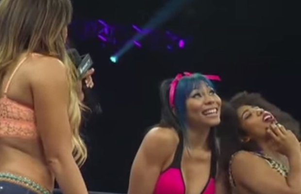 As Rebel tries to keep control of the match, Marti fights back and looks to cause trouble by pulling out a chair from under the ring. Earl Hebner springs into action, battling with Marti to drop that chair. All while that commotion takes place, Rebel finds herself in a battle against an interfering Jade, who chops Rebel three times on the chest before very innocently finding a seat on the ring apron and giving a high five to Marti for a good team effort.