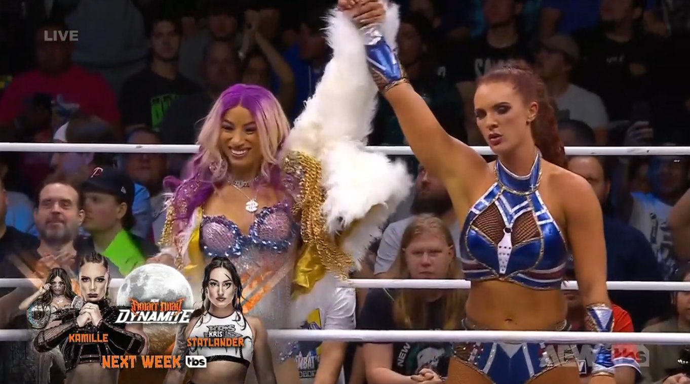 Aminata tries to fight back and Kamille meets a nasty elbow to the face, followed up with a neckbreaker. The Queen strikes her opponent through the ropes and meets Moné on the apron sending her a message.