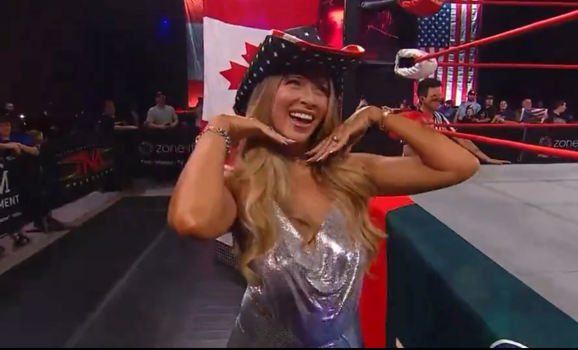 On Sunday, TNA had its Border Brawl special event which was Canada vs. the U.S.A. At the event, former WWE Divas Champion Kelly Kelly served as an ambassador for the U.S.A. While former TNA Knockouts Champion Allie held it down for Canada. The two exchanged a promo in the ring and Kelly accompanied Nic Nemeth to the ring. Allie accompanied Santino Marella.
