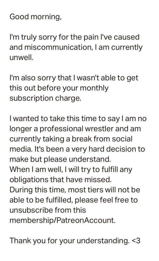 In this post to her subscribers, she also states that she is no longer a professional wrestler and that she is taking a break from social media. Her Twitter account is showing deactivated as her tweets are not available.
