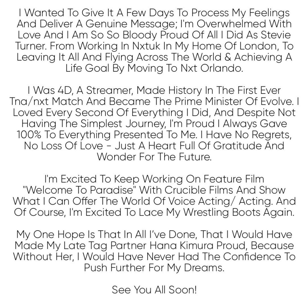 Lucy Bridge, formerly known as Stevie Turner in NXT and Evolve, has penned a letter about her exit from the company. Bridge was one of several names from Evolve /NXT that were either released or did not have their contract renewed. She was with the company for four years.