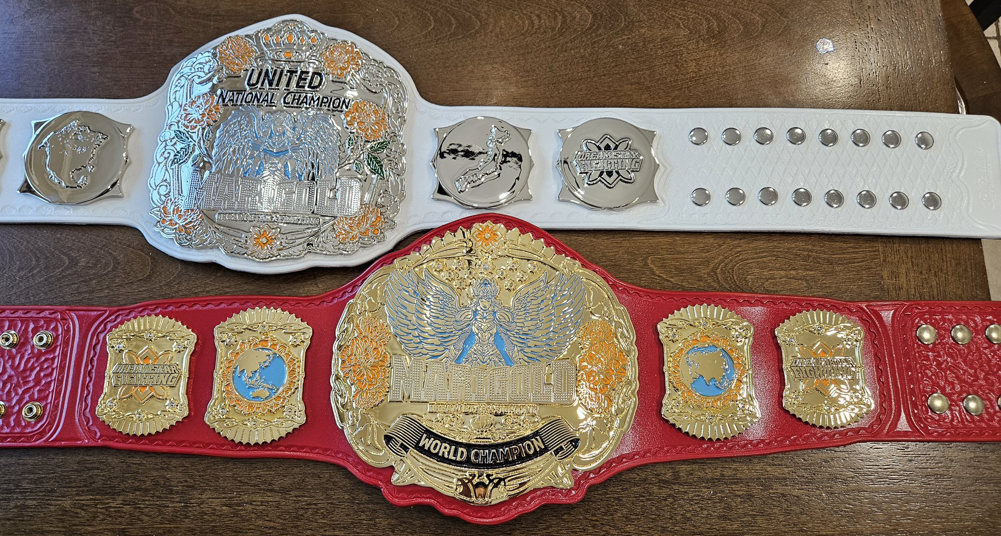 The red belt is the Marigold World Champions while the white belt is the Marigold United National Championship.