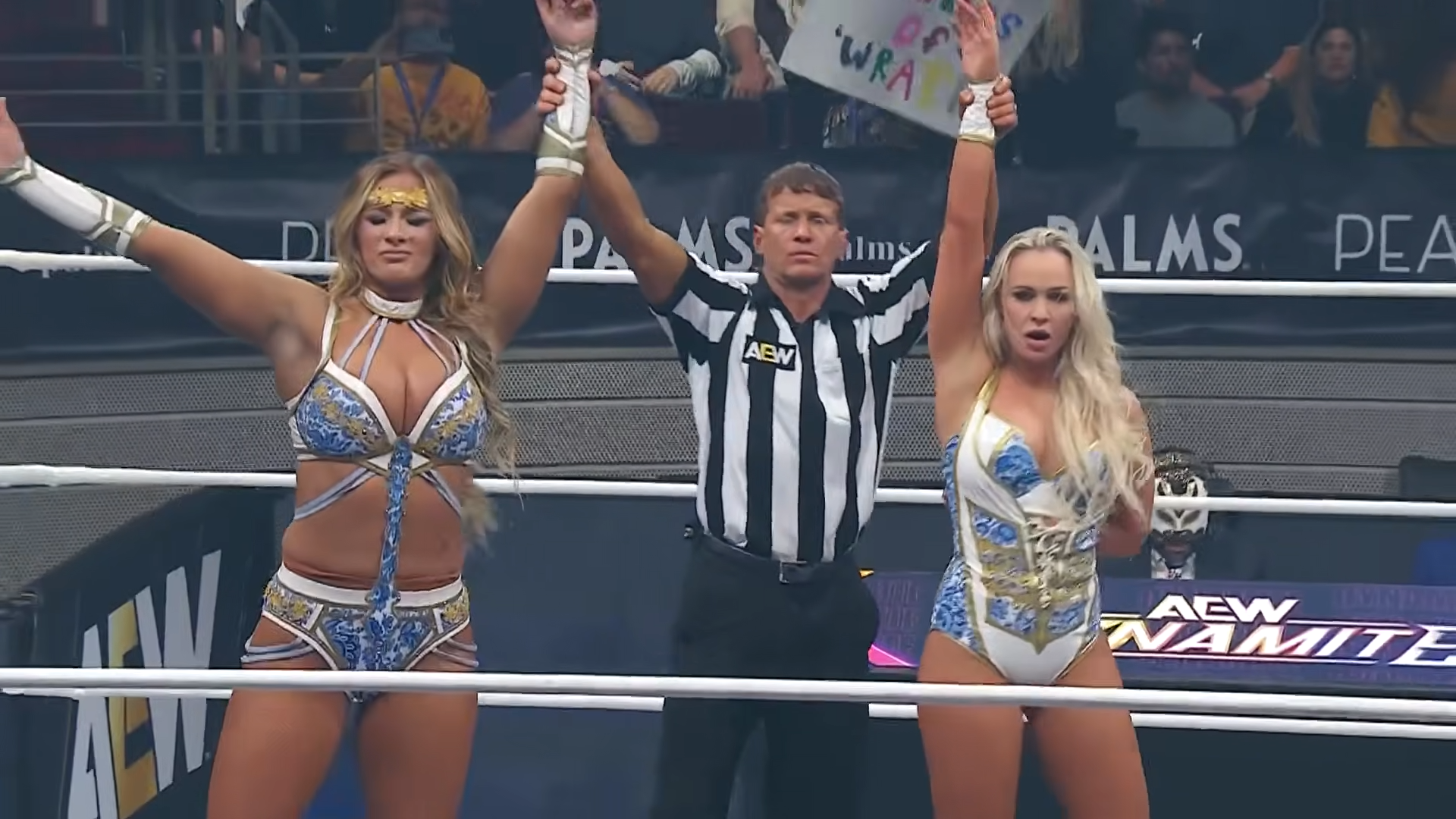 At Grand Slam Australia, “Timeless” Toni Storm will team up with Orange Cassidy to take on the likes of The Death Riders’ Marina Shafir and Wheeler Yuta in a Mixed Tornado Tag Team Hair Match. But tonight, they are in action against Jordan Oasis and Brittnie Brooks.