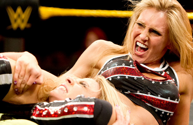 Sasha takes Emma down with a Lou Thesz Press before getting her banshee on, beating Emma’s head like crazy into the mat. After working over Emma with stomps and taunting, Charlotte gets back into the mix. After a double beat head and a pin attempt, the ‘Dirtiest Diva in the Game’ lives up to her name by choking Emma out on the ropes. Charlotte then uses her long frame to suck the life out of Emma with a nice figure-four neck lock. Woo! Emma isn’t woo-ing, she’s aah-ing in pain, and she does so for quite a lengthy time as she’s unable to make a tag to Paige. After some really rough commentary surrounding Charlotte’s submission, Emma bridges up and pins Charlotte for two in order to break the hold. Charlotte misses a big elbow drop following this, allowing Emma to tag in a very fresh Paige!