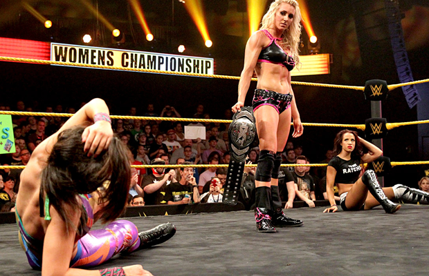 The crowd is firmly behind Bayley tonight as referee/king of the world, Drake Wuertz raises the title up to display what’s on the line. The fans break out a “Bayley’s Gonna Hug You” chant as Charlotte offers up a handshake. Bayley questions whether to accept it or not, but they finally start arguing and Bayley decides to shove Charlotte back into the corner and go psycho! Charlotte now with a stiff knee and some chops, sending Bayley off the ropes who runs forth with a crossbody! Bayley scores a nice elbow/kick/clothesline combo that I have trouble describing how cool it was, and now she’s fighting back and going for a backslide. Youch! Charlotte simply counters with a sick neckbreaker and begins to enter domination mode.